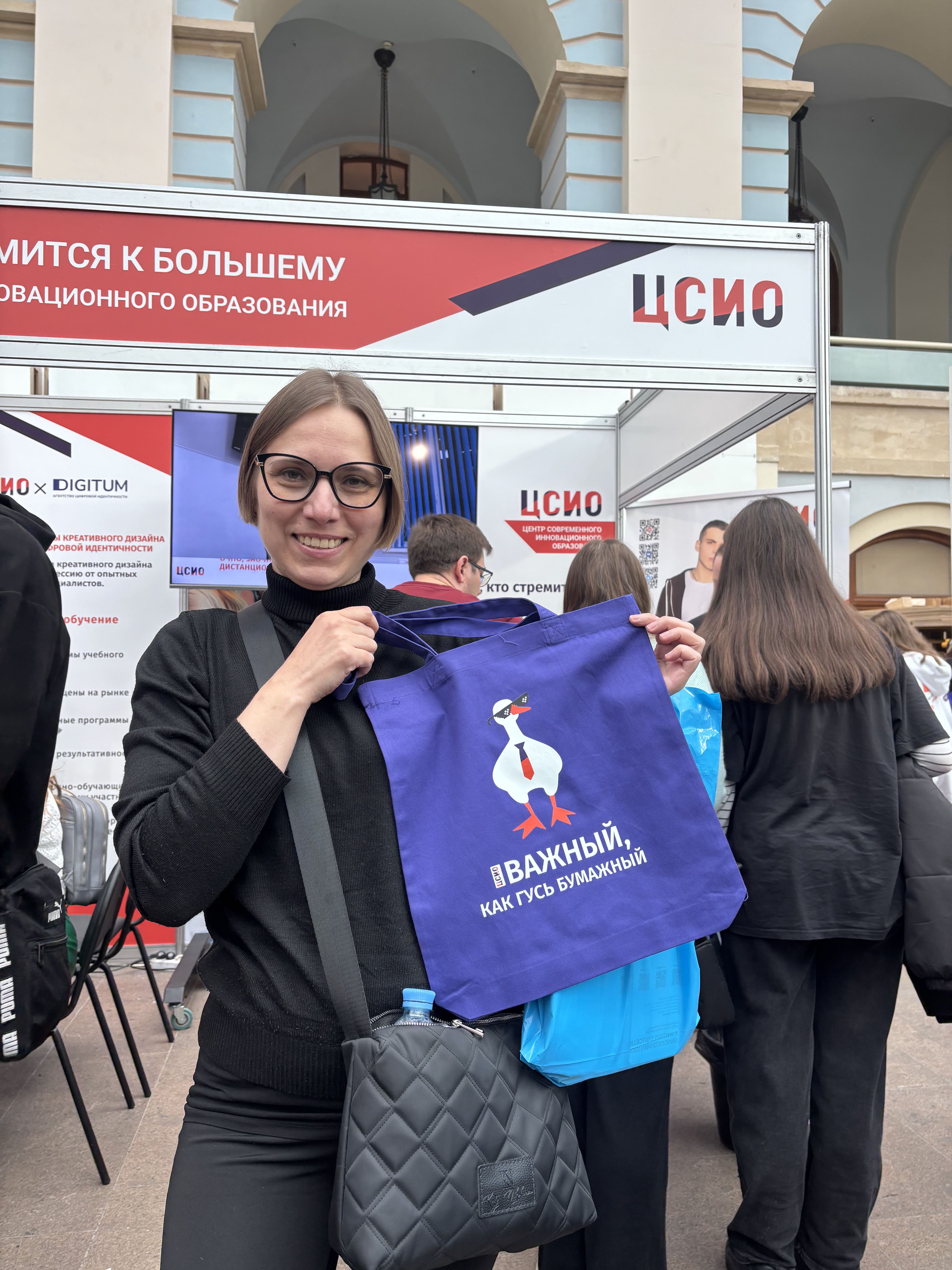 Счастливый момент вручения подарка победителю розыгрыша, проведённого на стенде ЦСИО. Радость участников и дружеская атмосфера стали отражением открытости и позитивного настроя команды центра.