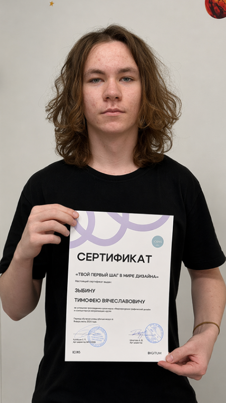 По завершении курса слушатель получил сертификат, подтверждающий освоение программы и первые шаги в направлении графического дизайна.